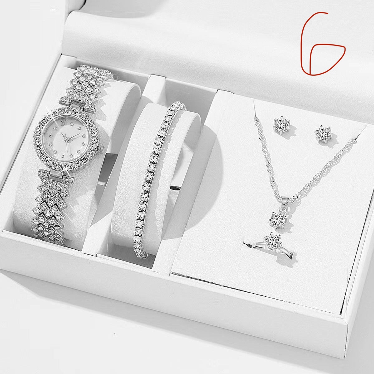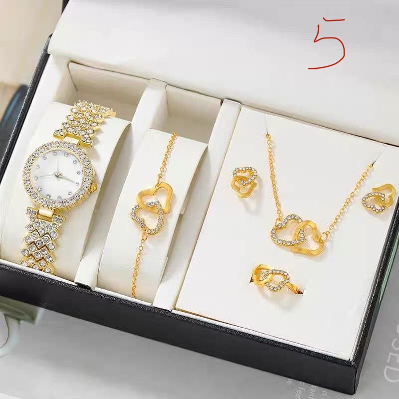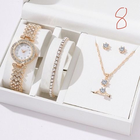 5 in 1 fashionable ladies temporament watch jewelry burst quartz watch gift box set window material : glass content : watch, bracelet, ear ring, neckless, ring water resistance : no waterproof case tickness : 10mm material : Alloy weight : 0.45kg size : 18*15*15