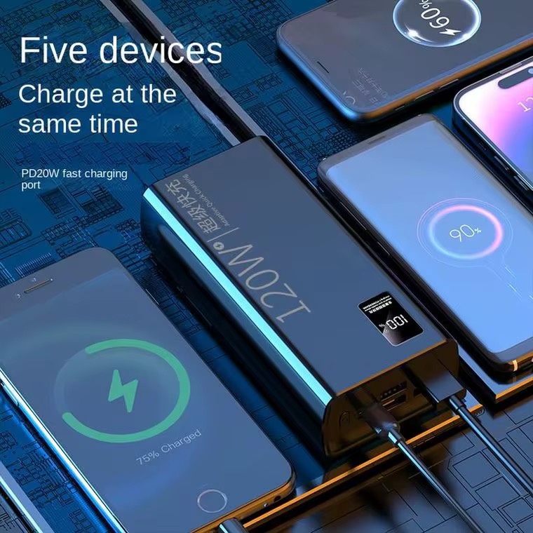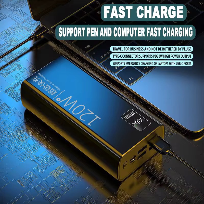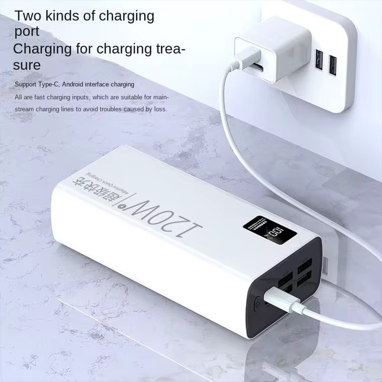 Supper fast 120W Power 20000 mAh suitable for all phones. Battery Type: Lithium Polymer Battery Shell Material : Plastic Colors: Black, white, Power Capacity: 20,000 mah Size : 144*67*30mm Charging power : PD 22.5W Maximum output: 120W Voltage: 5 Charging protocol: QC3.0