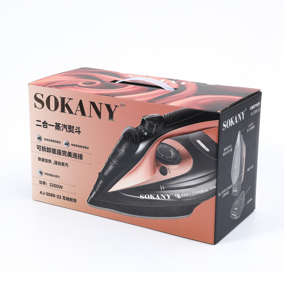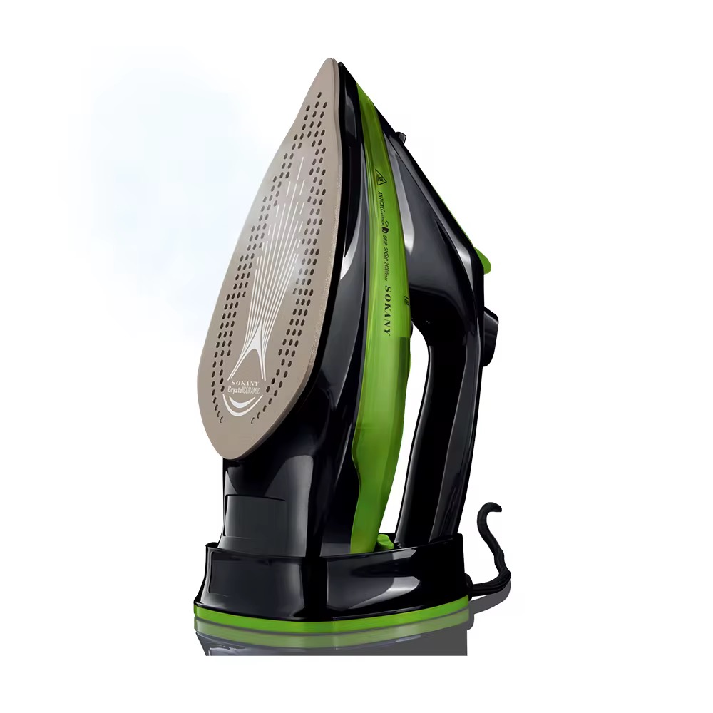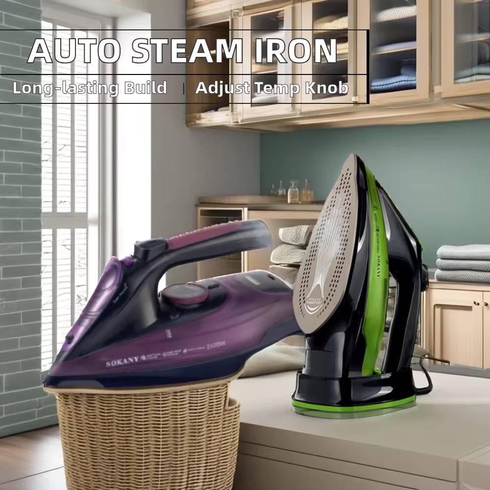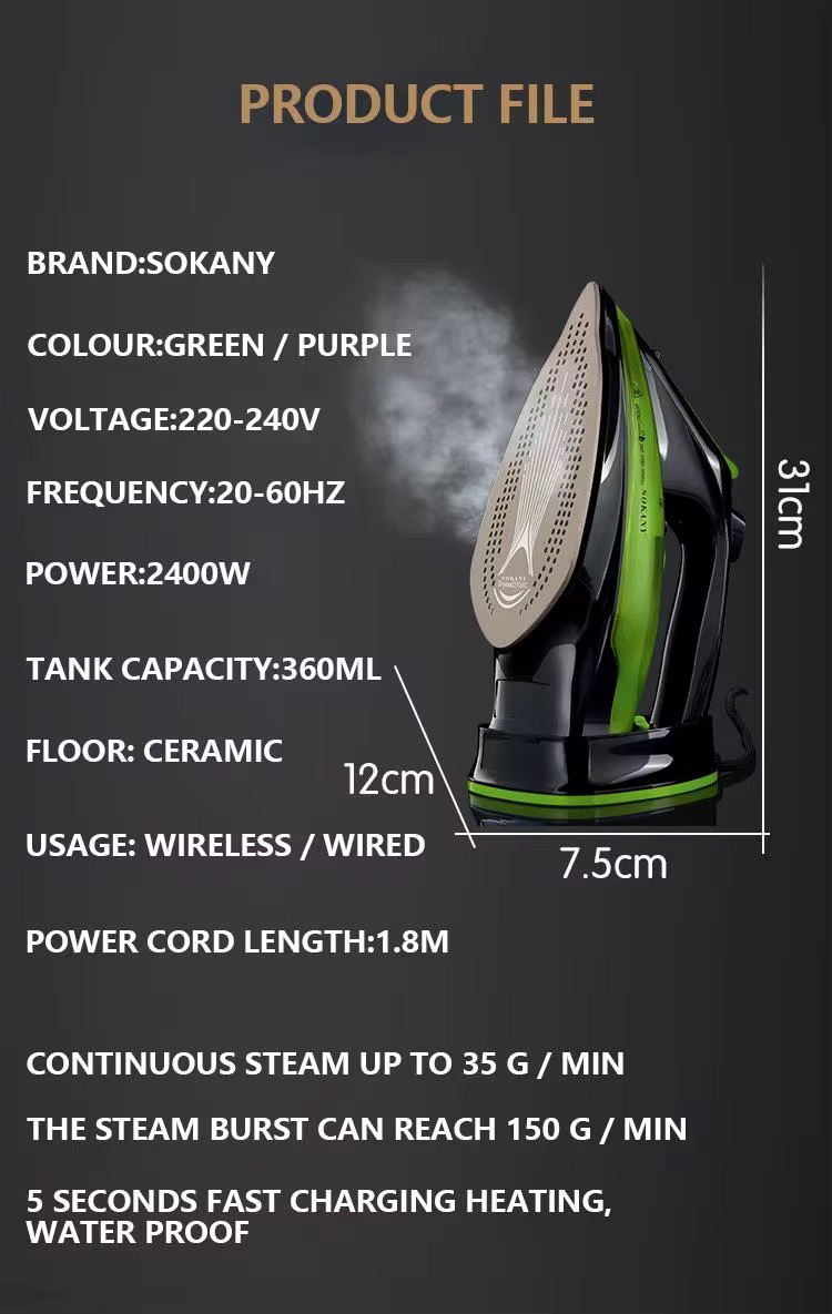Premium Brand Wireless Sokany Steam Iron Cordless Speed Adjustable Brand : SOKANY Colour : Green / Purple Voltage : 220-24V Frequency : 20-60HZ Tank Capacity : 360ml Floor : Creamic Usage : wireless/wired Power Cord Length : 1.8M Continuous Team up to 35G/min The steam burst can reach 150g/min 5 seconds charging heating Water Proof Weight : 1.75kg