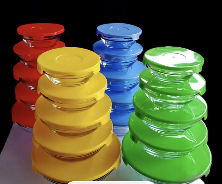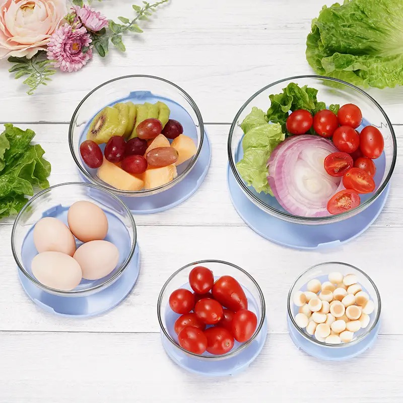Glass bowl food storage. Shape: Round 1 box: 5 pieces Place of Origin: China Applicable People:All Product name: Food Storage Container Material: Borosilicate Glass Usage: Kitchen Food Storage Color: Customized Color Function Multi-functional Food: Storage Boxs Keyword: Food Container Set Advantage: Safe Materials + Design Style China-Chic Lid PP: Plastic Lid