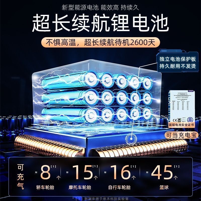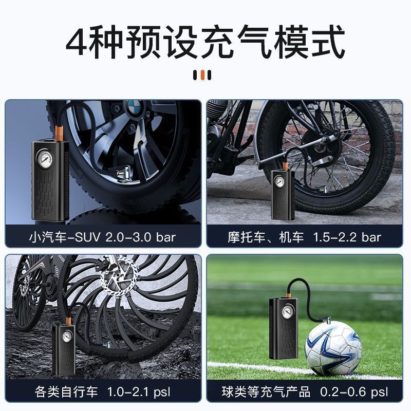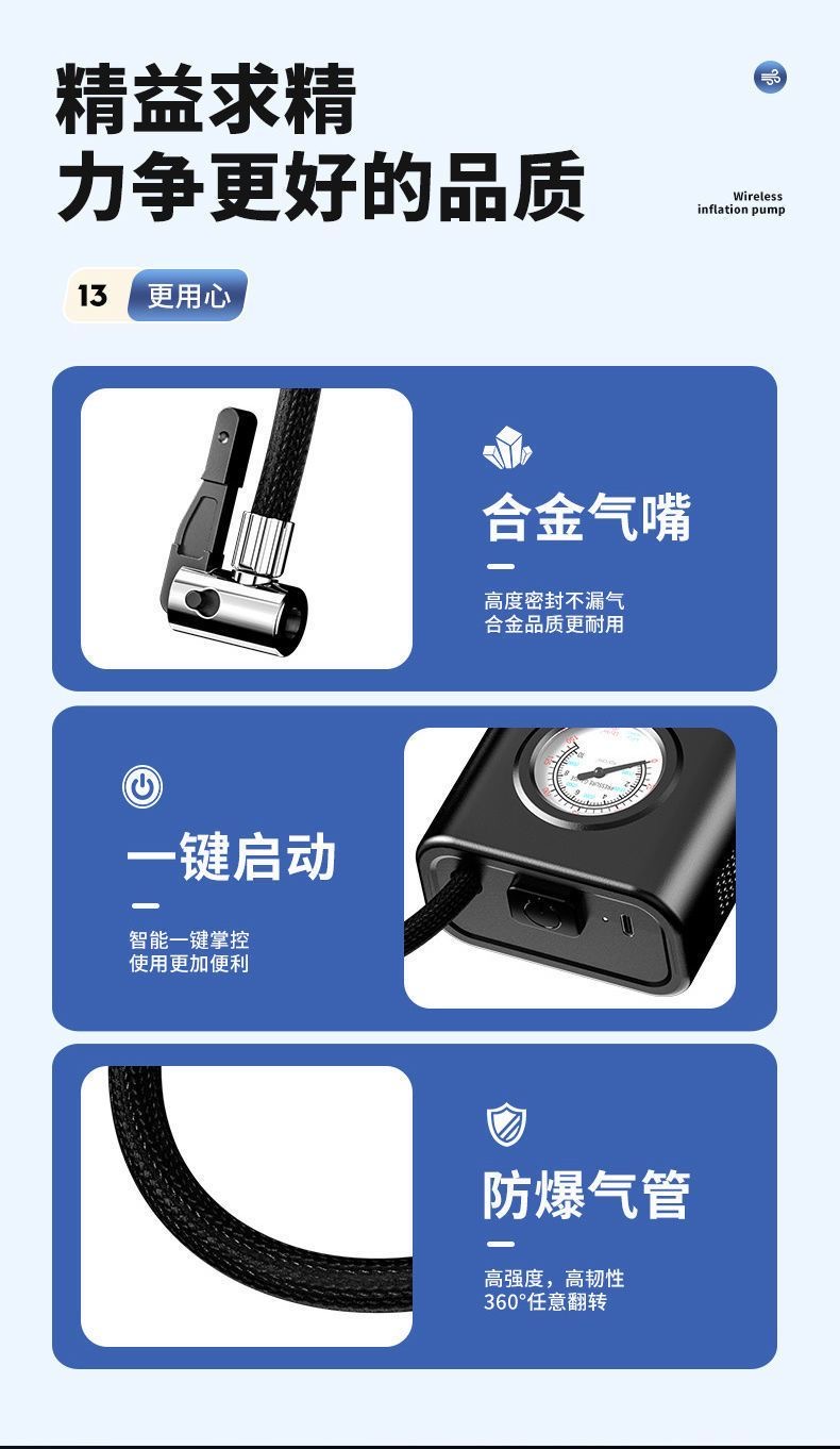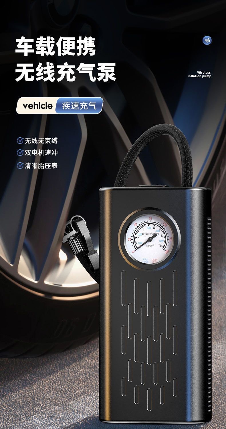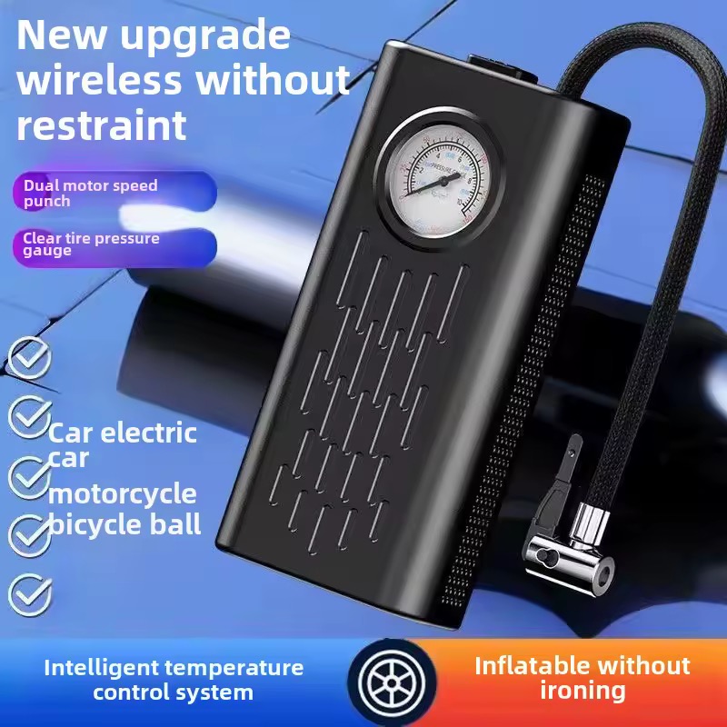High-power Portable car Wireless Air Pump Automatic USB Rechargeable Inflator for Small cars Power Supply : usb Control : Mechanical Control Power : 120 Material : Plastic Battery : 2400mAh size : 68*22*55cm weight : 0.6kg