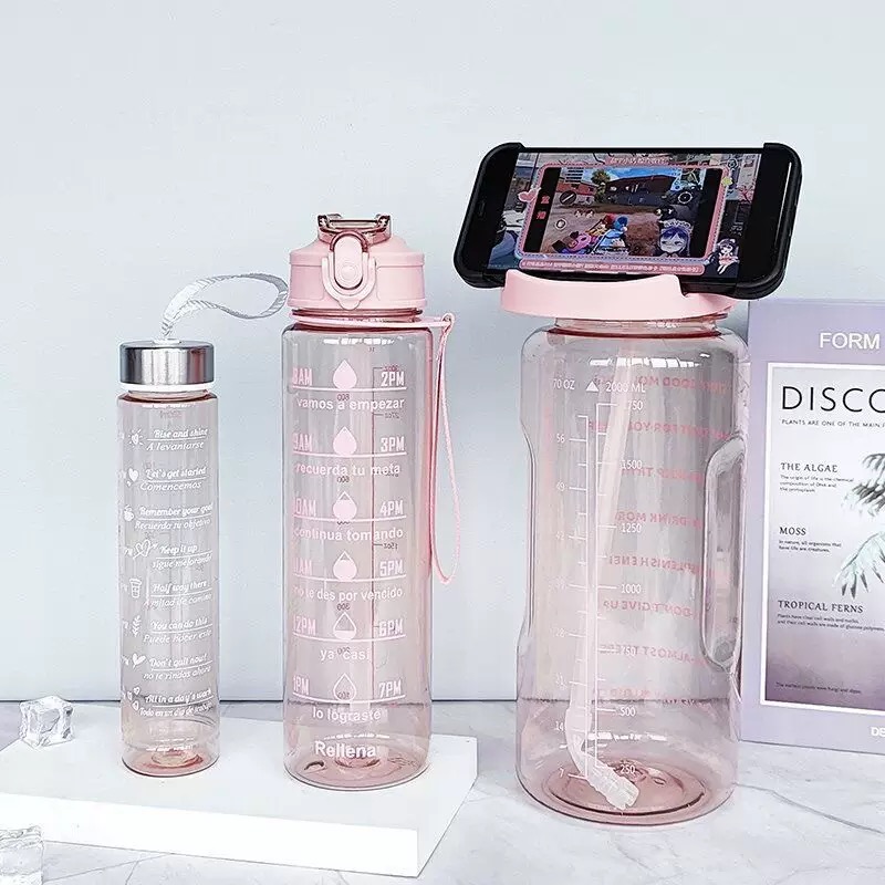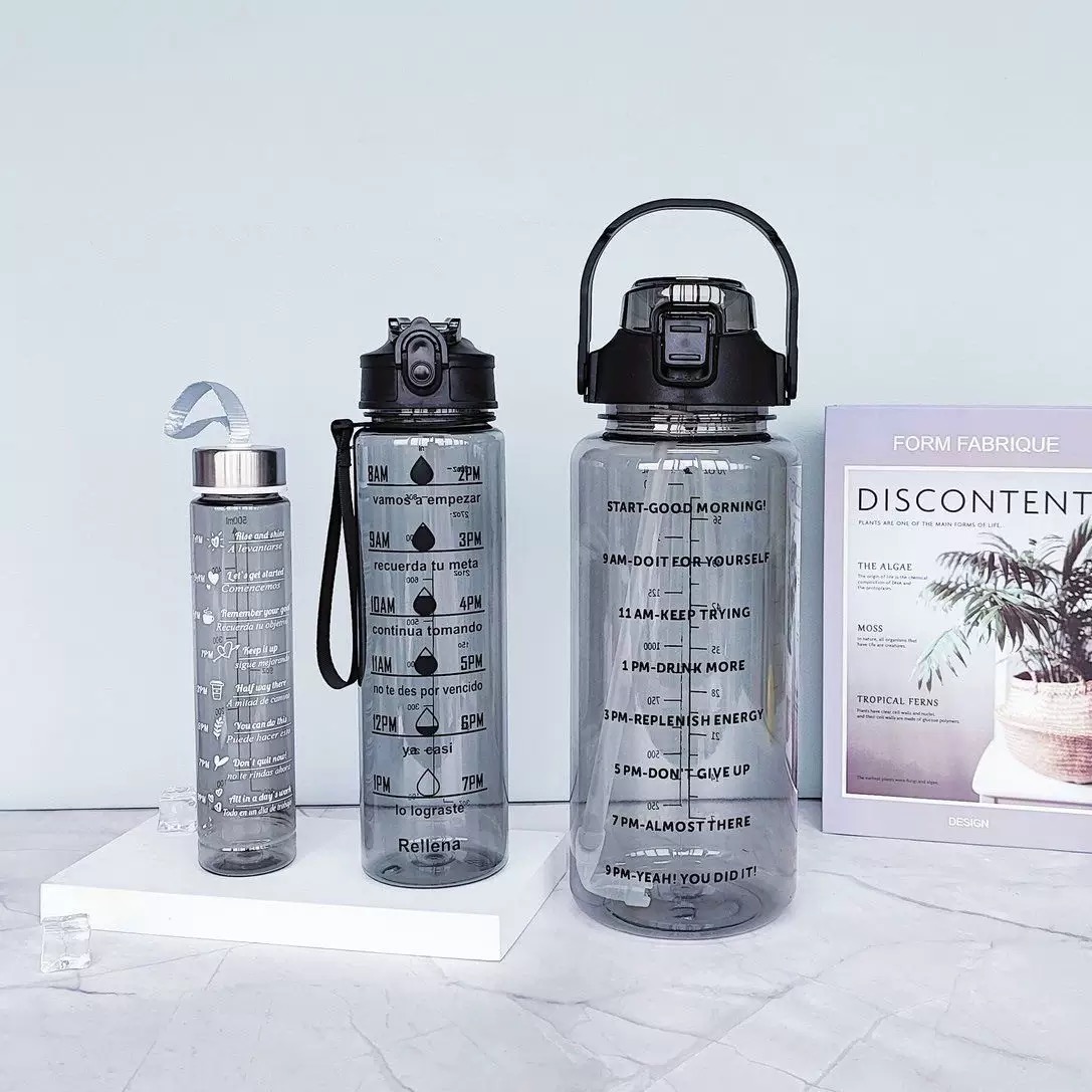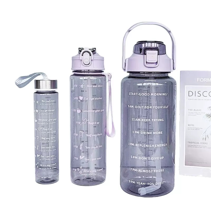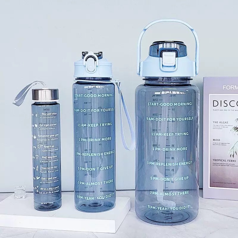 3 in 1 High Quality Transparent Bottle Material : PC Type : Straw with cap Style : modern Quantity : 3pcs Sizes : 300ml, 900ml, 2000ml Weight : 1kg