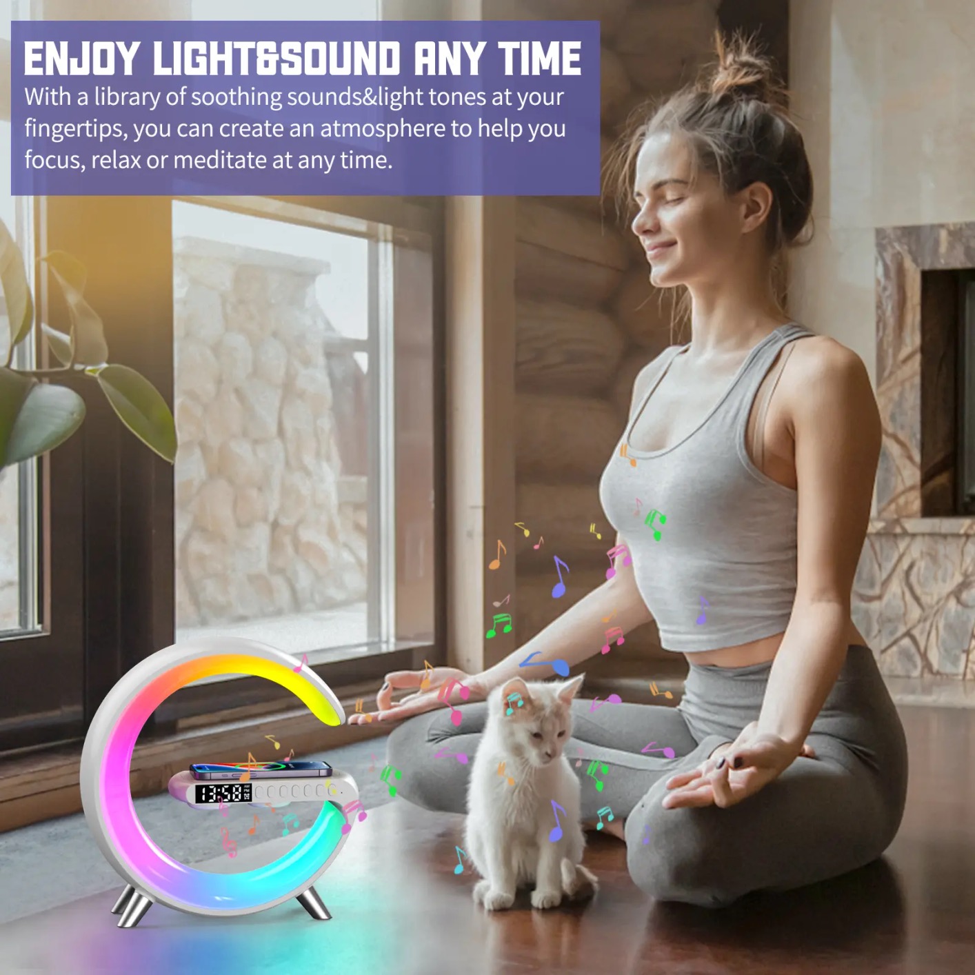 Bt Speaker Wireless Charger have battery with Speaker clock Alarm Smart App RGB Light Number of loudspeaker enclosure : 1 Cabinet Material: Plastic Built-in Microphone : Yes Support App : Yes Communication: USB Special Moid : wireless LED lighting: RGB LED Output: 3W Lighting Mood: 13types Weight: 0.6kg